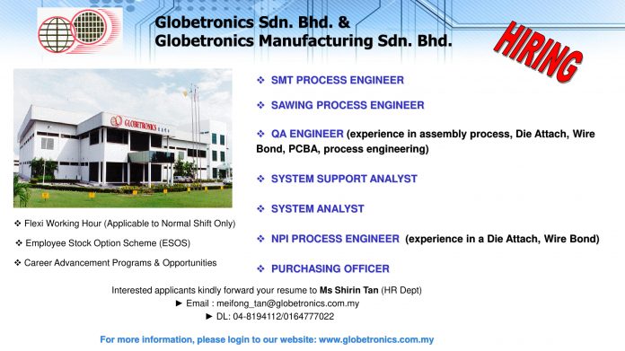 Globetronics Sdn. Bhd. & Globetronics Manufacturing Sdn. Bhd is Hiring! By penangcat - April 24, 2020 Bayan Lepas Posted on April 24, 2020 Applications have closed