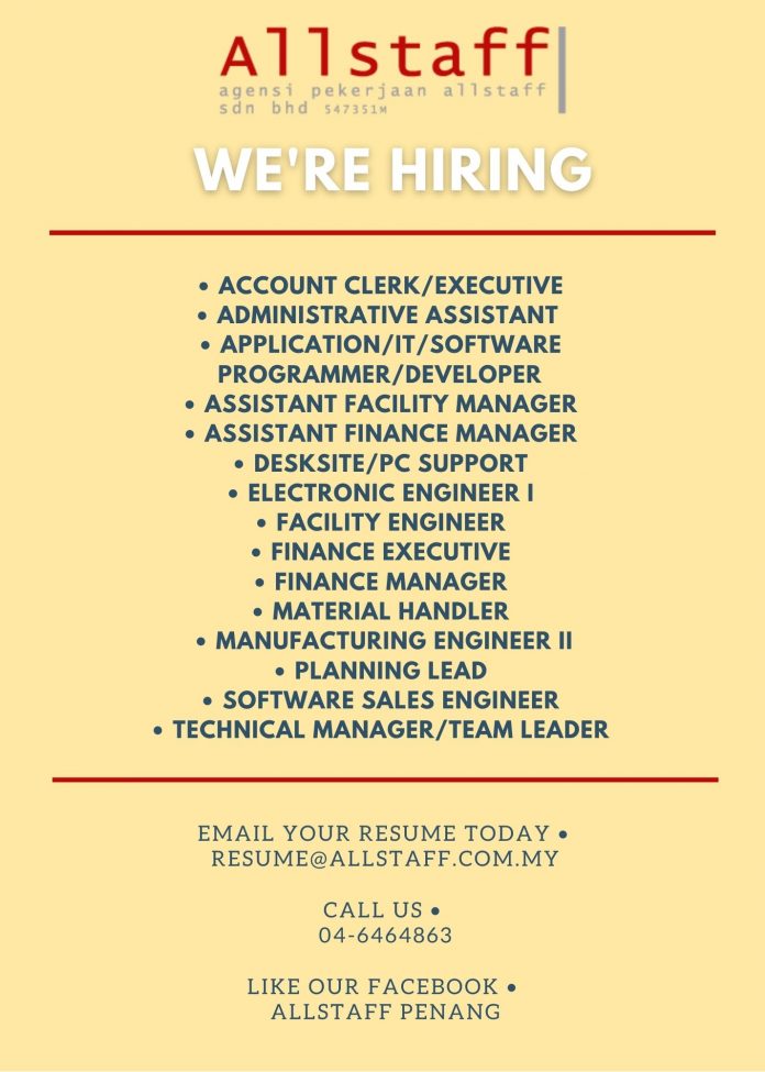 Agensi Pekerjaan Allstaff Sdn Bhd is Hiring! By penangcat - August 6, 2020 Penang Posted on August 6, 2020 Applications have closed