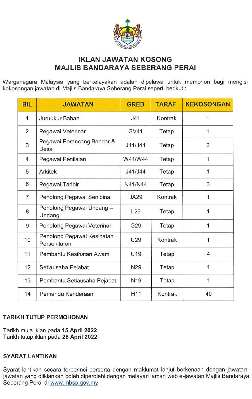 Syarat kelayakan jawatan yang diiklankan boleh dirujuk melalui laman web MBSP di http://www.mbsp.gov.my.