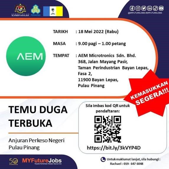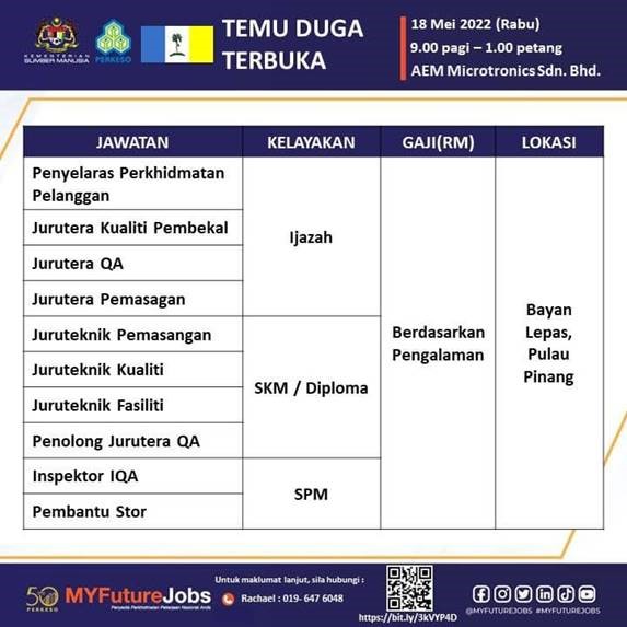 AEM Microtronics (M) Sdn. Bhd By penangcat - May 17, 2022 Penang Posted on May 17, 2022 Applications have closed Please bring along your resume, certificate, IC copy and payslip during the interview session.