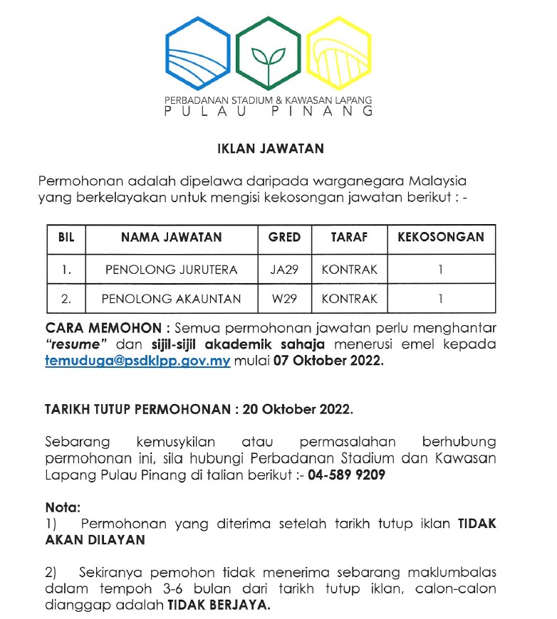 Jawatan Kosong Bertaraf Kontrak di Perbadanan Stadium & Kawasan Lapang Pulau Pinang.