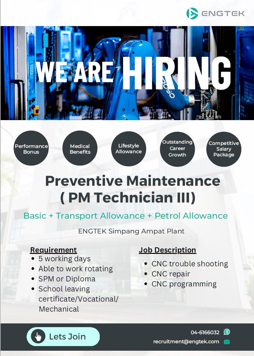 Interested candidates are invited to submit your application to recuitment@engtek.com or contact +604 616 6032 for more details.
