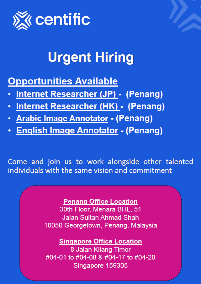 Interested candidates please send your resume to lim.minlee@centific.com or call +604 -2021088 for further enquiries.