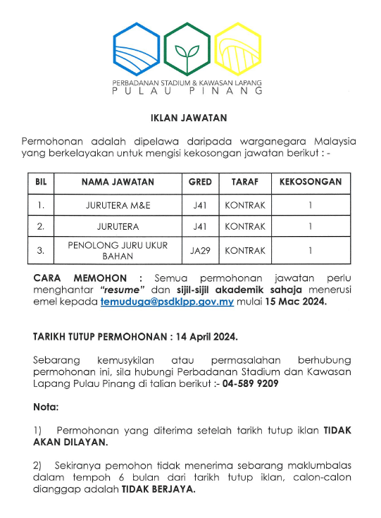 Jawatan Kosong bertaraf kontrak di Perbadanan Stadium & Kawasan Lapang Pulau Pinang