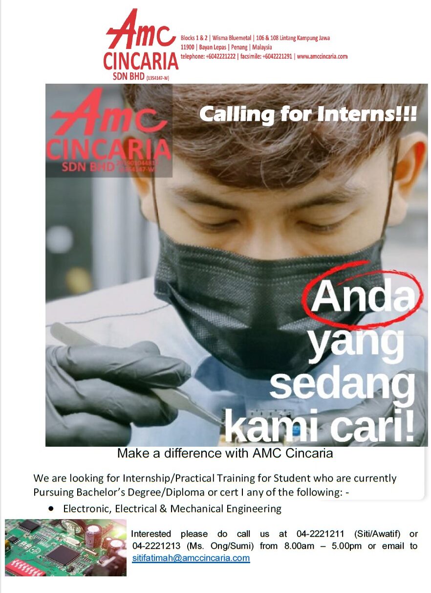 Internship Opening at AMC Cincaria Sdn. Bhd. By penangcat - April 13, 2022 Bayan Lepas, Pulau Pinang Posted on April 13, 2022 Applications have closed Website AMC Cincaria Sdn. Bhd.