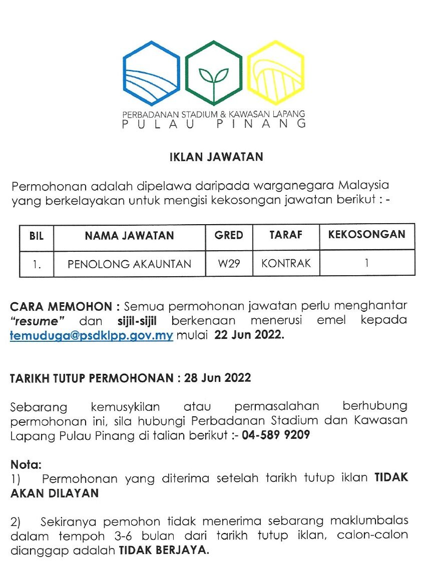 JAWATAN KOSONG DI PERBADANAN STADIUM & KAWASAN LAPANG PULAU PINANG By penangcat - June 22, 2022 Pulau Pinang Posted on June 22, 2022 Applications have closed PERBADANAN STADIUM & KAWASAN LAPANG PULAU PINANG Tarikh tutup permohonan : 28 Jun 2022 Sila hubungi Perbadanan Stadium dan Kawasan Lapang Pulau Pinang di talian 04-589 9209 untuk sebarang kemusykilan.